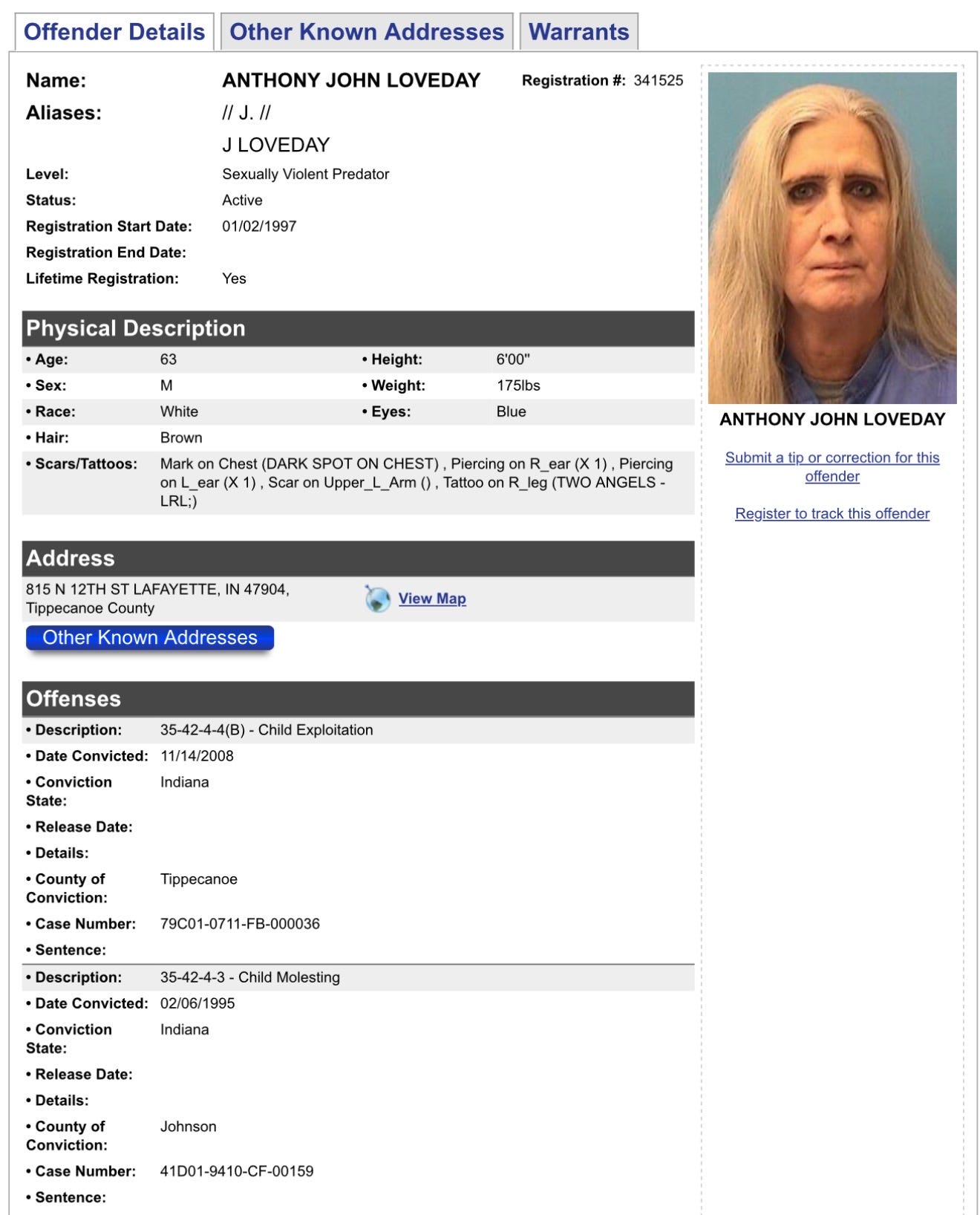 Indiana Sex OffendersAnthony John Loveday | Tippecanoe County | ๐จ Sexual Predator Alert ๐จ Hoosier MugsMar 16, 2026ShareCharges: 35-42-4-4(B) - Child Exploitation35-42-4-3 - Child Molesting