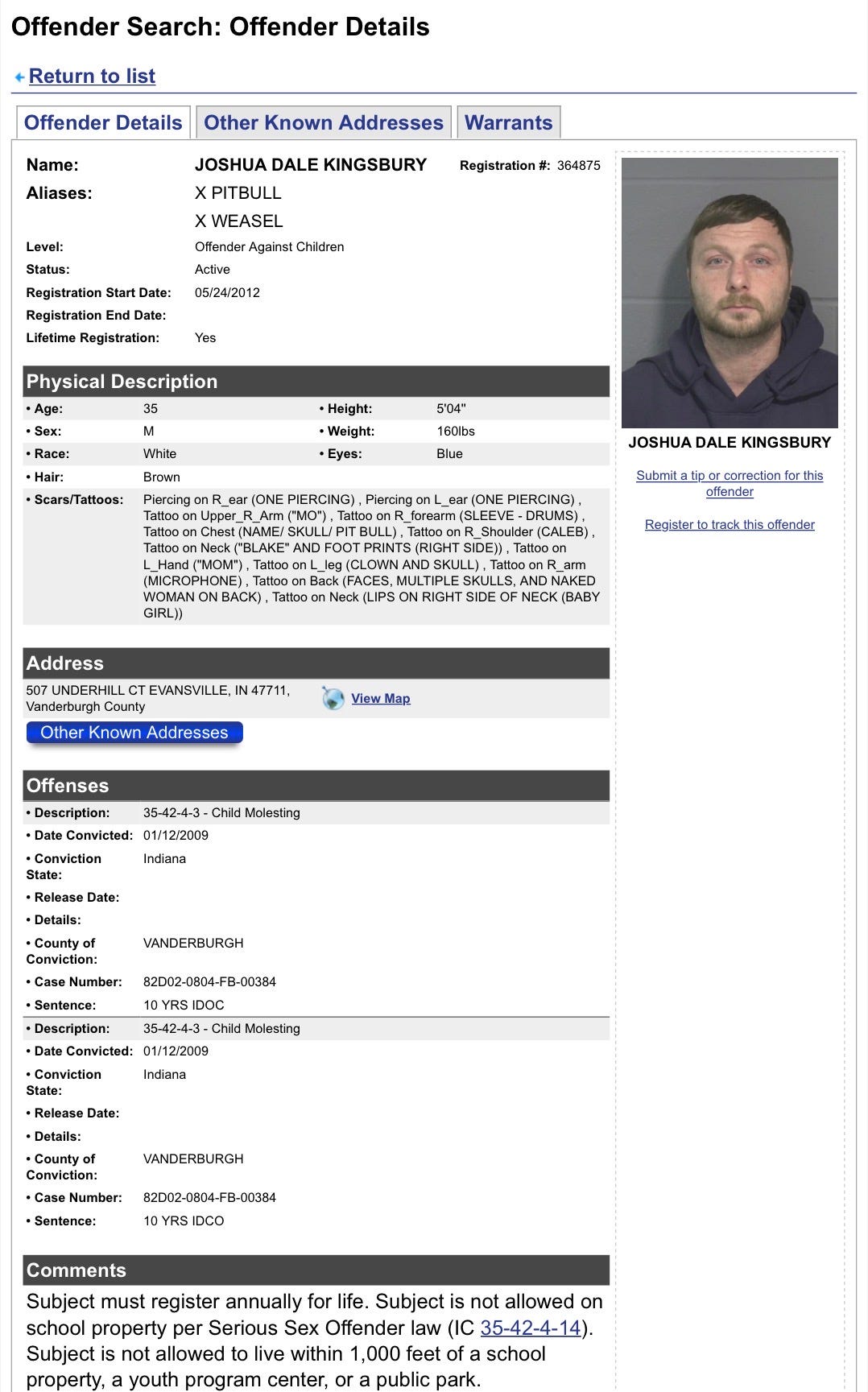 Indiana Sex OffendersJoshua Dale Kingsbury - (🚨Sexual Predator Alert 🚨)#VanderburghCountyHoosier MugsFeb 02, 20261ShareCharges:CORRECTION- SEX OFFENDER FAIL TO POSSESS INDIANA DRIVERS LICMOTOR VEHICLE- DRIVING WHILE SUSPENDED- PRIOR SUSPENSION WIT