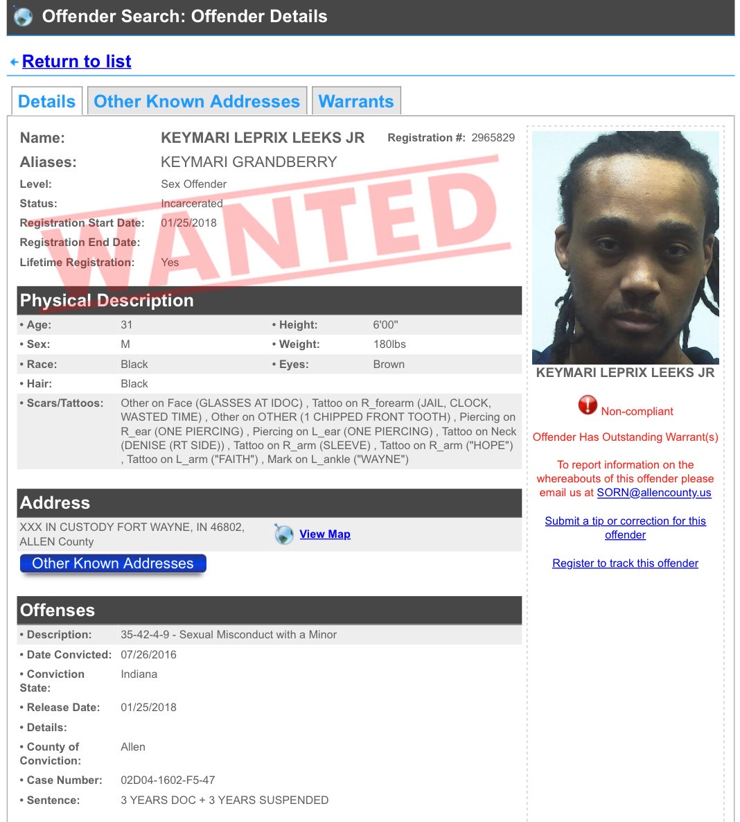 Indiana Sex OffendersKeymari Leprix Leeks Jr (Child Sexual Predator)#FortWayneHoosier MugsJan 27, 20261Share🚨Child Sexual Predator Alert 🚨CHARGESStatute 11-8-8-17(b)Statute Description SEX / VIOLENT OFFENDER - FAIL TO REGISTER - PRIORCause Number 02D06-2601-F5-36Bond Type PRE-TRIAL SERVICESBond Amt $10000Prior charges include sexual misconduct with a minor.